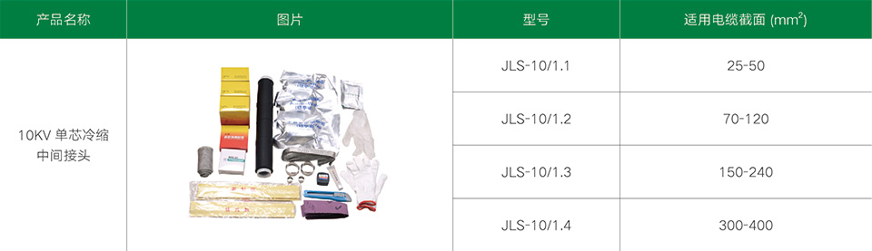 10KV單芯冷縮中間接頭適用于3.6/6、6/10、8.7/10、8.7/15kV單芯聚乙烯和交聯(lián)聚乙烯電力電纜。采用液態(tài)硅橡膠制造,集防水、應力控制、屏蔽、絕緣于一體。具有良好的電氣性能和機械性能,能在各種惡劣的環(huán)境條件下長期使用。具有重量輕、安裝方便等優(yōu)點。廣泛地應用于電力、石油、化工、冶金、鐵路、港口和建筑等各個領域。