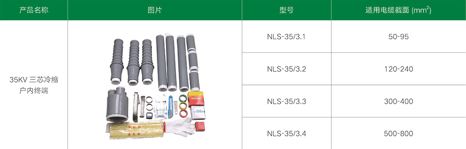 35kV三芯冷縮電纜附件系列產(chǎn)品,適用于21/35、26/35kV三芯聚乙烯和交聯(lián)聚乙烯電力電纜。冷縮電纜附件采用進(jìn)口液態(tài)硅橡膠材料制造而成,不但具有十分優(yōu)良的電氣性能,而且還具有優(yōu)異的憎水性、高彈性、使用壽命長及恒定的收縮壓力等物理特性。采用冷縮電纜附件,無需明火及特殊工具,只需輕輕抽取塑料支撐條即可,就能自動(dòng)收縮復(fù)位,安裝非常方便于工作。具有良好的電氣性能和機(jī)械性能,能在各種惡劣的環(huán)境條件下長期使用。具有重量輕、安裝方便等優(yōu)點(diǎn)。廣泛地應(yīng)用于電力、石油、化工、冶金、鐵路、港口和建筑各個(gè)領(lǐng)域。