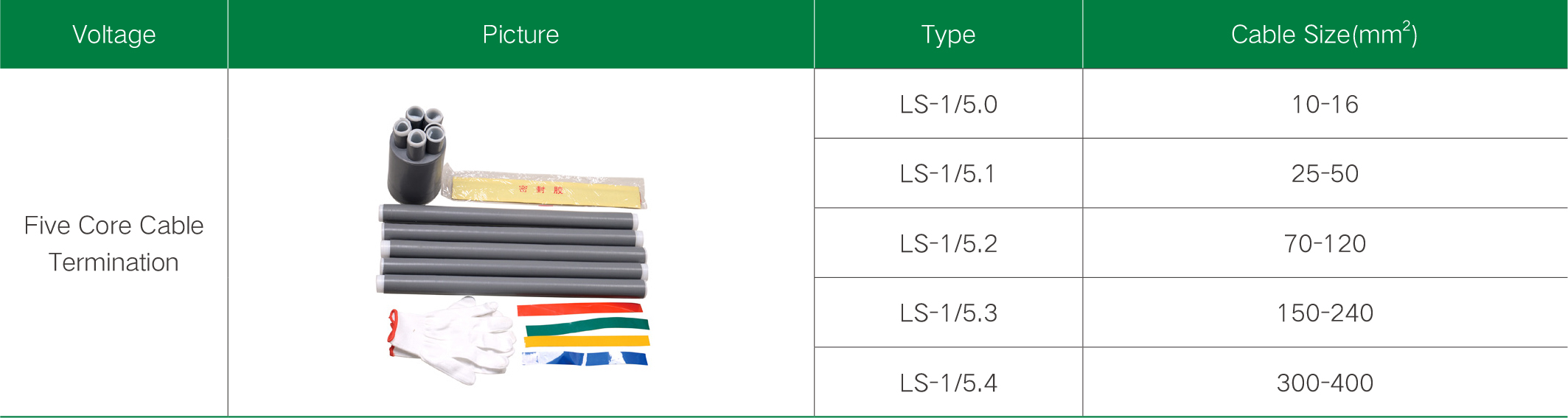 1kV cold shrinkable terminal series products, suitable for 0.6/1kV single-core, two-core, three-core, four-core, five-core polyvinyl chloride, cross-linked polyethylene, rubber and plastic power cables, with good electrical and mechanical properties, can be used for a long time under various harsh environmental conditions. It has the advantages of light weight and easy installation. It is widely used in electric power, petroleum, chemical industry, metallurgy, railway port and construction and other fields.