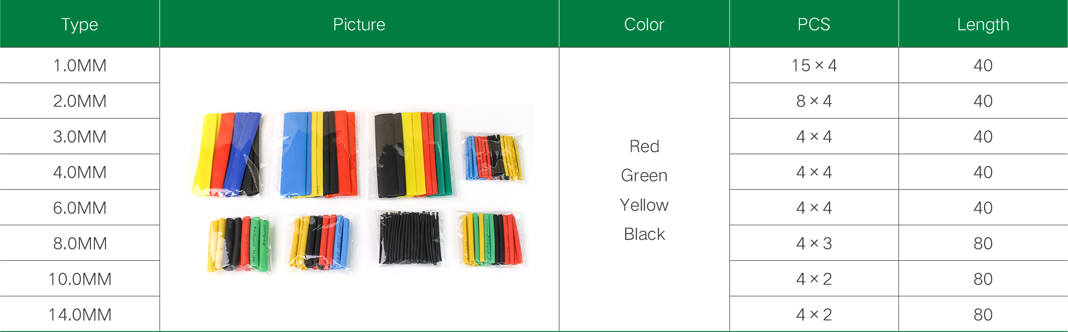 A household heat shrink tubing set is an electronic material used for insulation, repair, and protection of wires and cables in the home. It usually consists of a set of heat shrink tubing equipped with other necessary accessories to provide a simple and effective solution for wire insulation and maintenance.